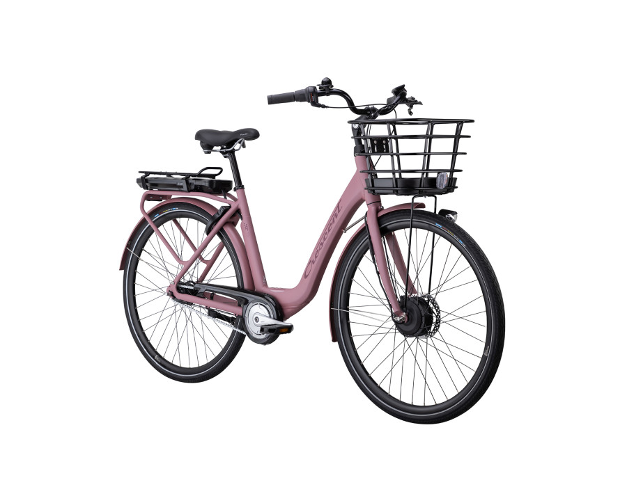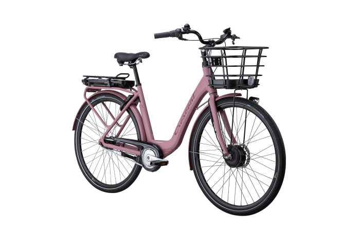 Allt är snyggt inbyggt i en 7-växlad damcykel av modernt snitt, med lågt insteg, fotbroms bak och skivbroms fram. Displayen på styret håller dig uppdaterad och cykelns batteri sitter i pakethållaren, som dessutom har en smart funktion där du enkelt klickar av och på en väska eller korg. Cykelkorg framtill ingår, liksom stöd, godkänt lås och belysning.